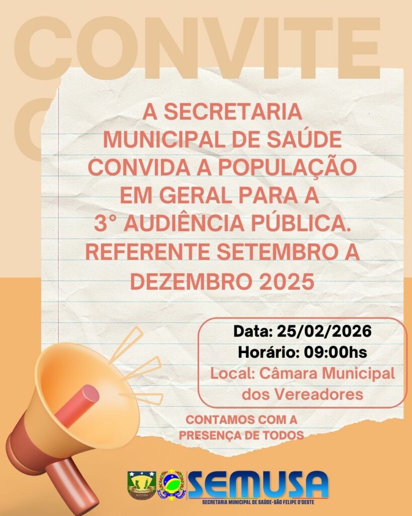 CONVITE PARA A 3º AUDIÊNCIA PÚBLICA REFEREBTE A SETEMBRO E DEZEMBRO DE 2025 – SEMUSA